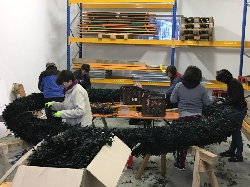 Nach einer ruhigen Nacht begannen die Vorarbeiten zum Aufstellen des Baumes bereits kurz nach sechs Uhr. Die Kränze wurden mit blau-weißen Bändern geschmückt und der Baum Meter für Meter entrindet und gehobelt. Viele Hände halfen mit, sodass um 14 Uhr alles zum Aufstellen bereit war.