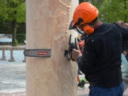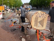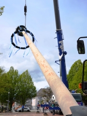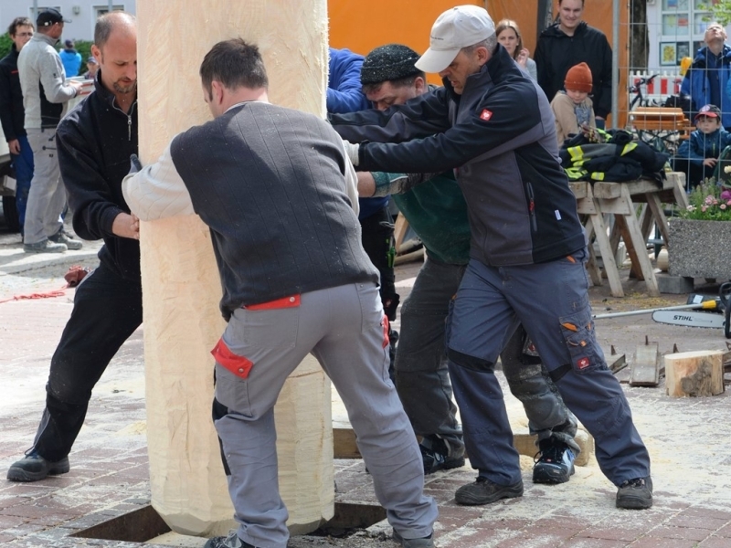 Das vermeintlich einfache Versenken im vorgesehenen Schacht auf dem Rathausplatz dagegen sorgte für mehr Spannung. Denn der Stamm war zu dick. So musste er am Kran hängend erneut bearbeitet werden. Mit vereinten Kräften wurde der Bobinger Maibaum dann nach einer Stunde möglichst gerade ausgerichtet und stabil verankert. Nun konnten mit Hilfe der Drehleiter der Feuerwehr die traditionellen Maibaumsymbole angebracht werden. Stolz und schön geschmückt stand er nun am Rathausplatz, bereit für die Feierlichkeiten der nächsten Tage.