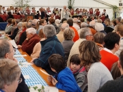 Angelockt durch das schöne Wetter und vielleicht auch der schwungvollen Blasmusik der Stadtkapelle, wurden es während des Mittagessens immer mehr. Familie Naumann versorgte die Gäste mit warmem Essen. Kolpingmitglieder schenkten Getränke aus und verkauften am Nachmittag Kaffee und Kuchen.