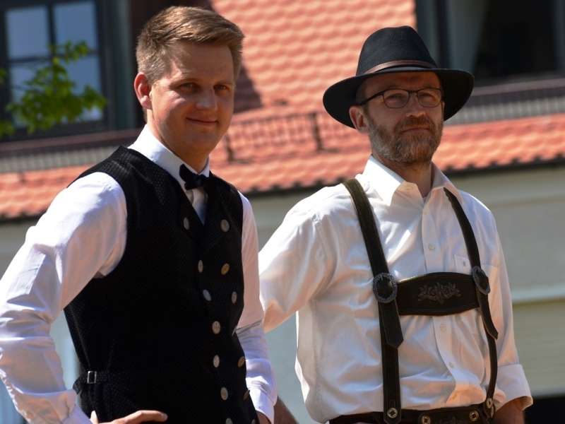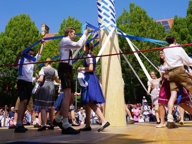 Walter Fehle als stellvertretender Vorsitzender stellte die einzelnen Tänze und Tänzer kurz vor. Beim Bandltanz vollenden die 16 jungen Tänzer das Schmücken des Baums, indem sie ein weiß-blaues Rautenmuster an den Baum flechten. Als zweiter Tanz folgte das Mühlradl. Wie die Räder einer Mühle greifen die Tanzfiguren hier ineinander. Zum Abschluss folgte der Achtertanz, eine ureigene Bobinger Tradition. Nachdem auch diese vier Paare ihren Tanz um den Maibaum unter viel Applaus vollendet hatten, war der offizielle Teil der Maifeier beendet.