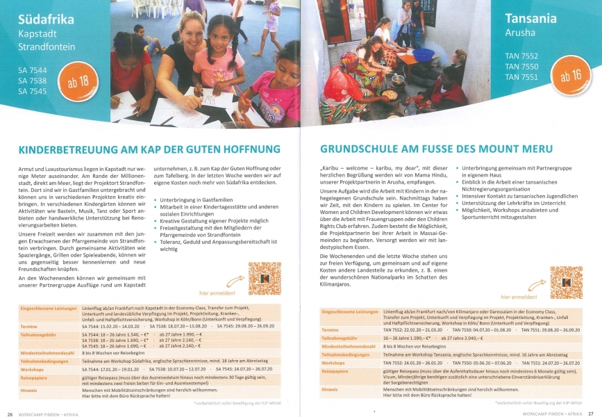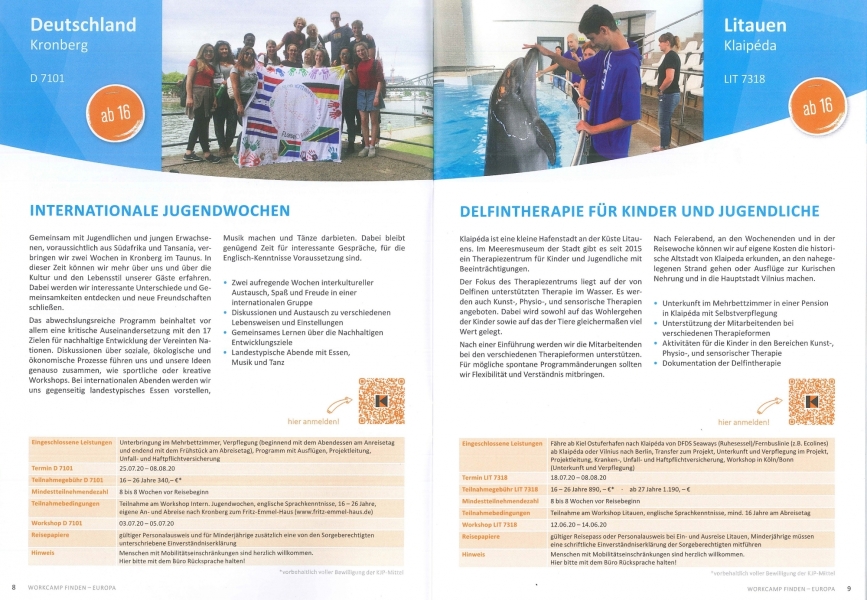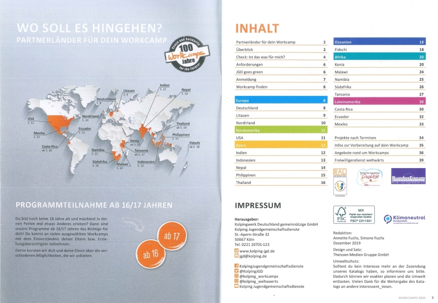In frischer Optik zeigt der Katalog, in welchen Ländern Workcamps angeboten werden und informiert über weltweit stattfindende Projekte. Zum Beispiel können Jugendliche in Litauen bei einer Delfintherapie für benachteiligte Kinder mitwirken, beim Umweltschutz auf Galápagos mit anpacken oder sich im ländlichen Kenia bei der Kinderbetreuung einbringen. Diese und viele weitere Projekte sowie alle Informationen zur Anmeldung und zum Ablauf des Workcamps finden sich im neuen Katalog.
