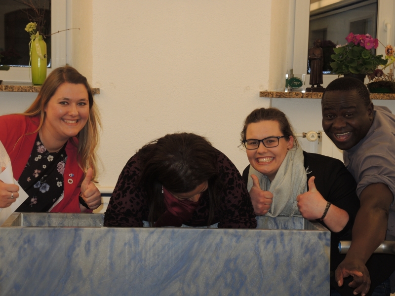 Nach einem Gespräch mit Werner Moritz, Geschäftsführer der Kolpingstiftung-Rudolf-Geiselberger und des Kolping-Bildungswerkes, wurde das Trio dann komplett: Um die Mittagszeit landete Paula Galo, Nationalvorsitzende von Kolping Südafrika, am Flughafen in München und durfte sich gleich dem vollgepackten Programm anschließen. Zusammen mit Daniela Dörfler von der Diözesanleitung ging es zur Kolping Akademie Kaufbeuren und ins Crescentiakloster. Doch der Weg war kein leichter! Durch den Berufsverkehr aus der Stadt Augsburg herauszukommen war nicht einfach und so war es für Father Kizito schon das zweite Wunder der Woche, dass auch dieser Termin pünktlich erreicht wurde. Seinen krönenden Abschluss fand der Tag in der Teilnahme an „Kolping und Wirtschaft“, der Veranstaltung zum Josefstag in der KurOase im Kloster Bad Wörishofen. Bei der abschließenden Führung durch das Hotel kündigte Father Kizito vor seinem ersten Kneippschen Armbad mit einem Augenzwinkern an, dass er nun das Wasser im Becken zu Wein wandeln werde. Spätestens da war allen klar: An diesem Gast ist ein Patron der Frohsinnigen verloren gegangen. Aber was noch nicht ist, kann ja noch werden!