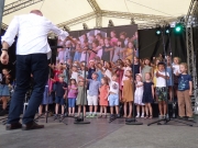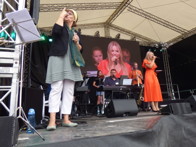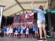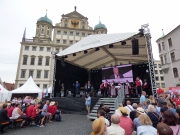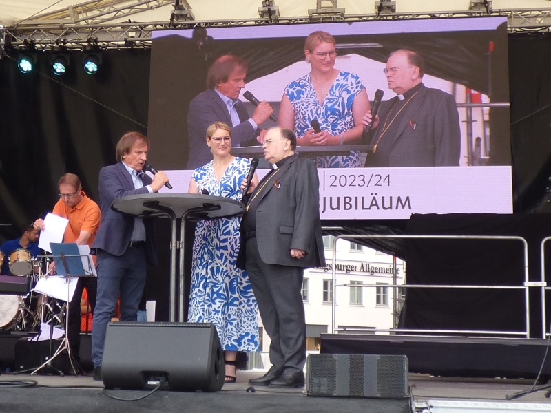Auf der Bühne gab es vier Stunden ein buntes Programm mit Kinderchören, Akrobatik- und Tanzgruppen, einem Chor mit Trommelgruppe aus Uganda, Interviews, einer Modenschau der aktion hoffnung und dem Kolping-Blasorchester Göggingen. Wolfgang Küpper, langjähriger Leiter der Redaktion „Religion und Orientierung“ des Bayerischen Rundfunks moderierte das Bühnenprogramm. Wie auf einer Klangwelle war der ganze Tag getragen vom Ulrichslied von Robert Haas: „Sankt Ulrich, du begleite dein Volk in Stadt und Land. Steh fest an seiner Seite und reich uns deine Hand.“