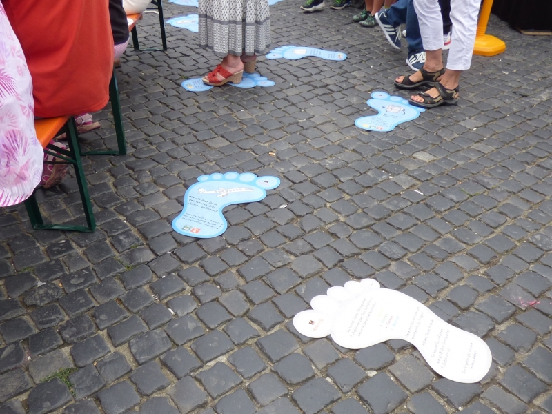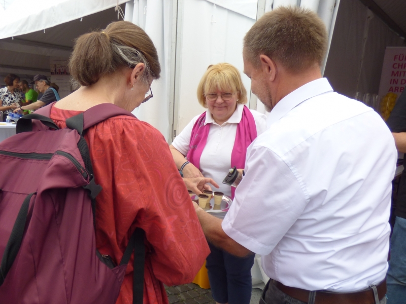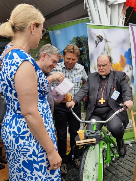 Franz Nusser, Heinz Schaaf und Johann Michael Geisenfelder informierten an der WählBar über die Besucher des Auftaktfestes über die Kolpingarbeit. Bei einem alkoholfreien Cocktail konnte man miteinander ins Gespräch kommen. Auch die anderen katholischen Verbände waren vertreten. Die Katholische Landvolkbewegung (KLB) zum Beispiel war mit einem durch ein Fahrrad angetriebenen Milchshake-Mixer oder die Katholische Arbeitnehmer-Bewegung (KAB) und die Christliche Arbeiterjugend (CAJ) waren mit dem heiligen Prekarius, dem Schutzpatron aller Menschen in prekären Lebens- und Arbeitsverhältnissen, vertreten.
