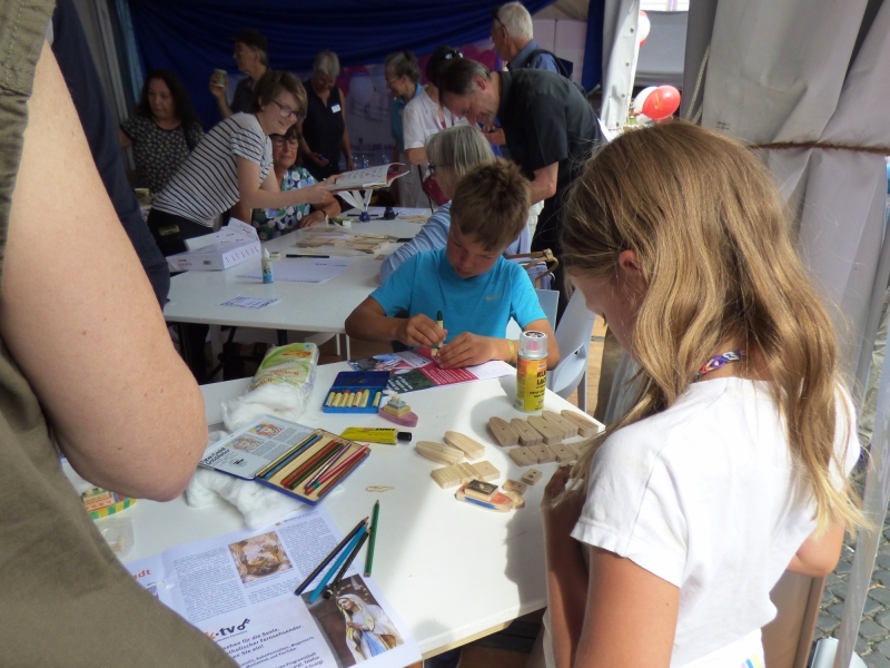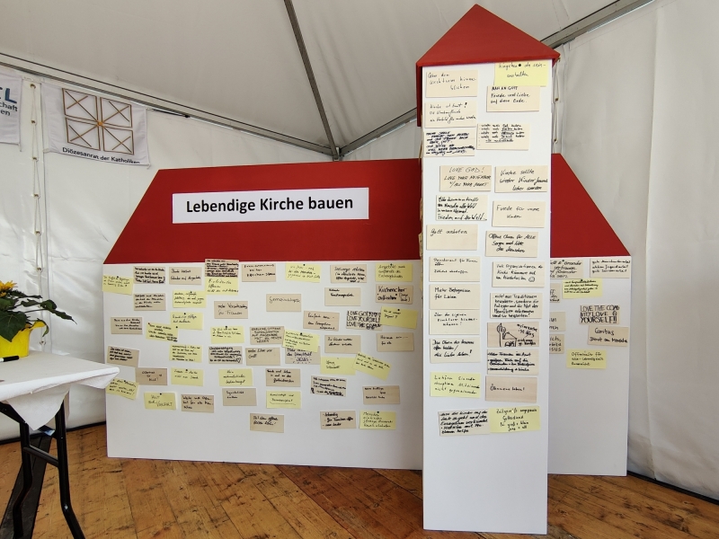 Am Stand des Diözesanrates der Katholiken im Bistum Augsburg konnten alle, die wollten, ihre Wüschen für eine lebendige Kirche an ein großes Kirchenmodell hängen. „Die Vielfalt an Begabungen als Chance schätzen anstatt als Bedrohung fürchten“, war da zum Beispiel zu lesen. „Mehr Ehre vor Gott“, „Synodalität einüben“, „Einfach sein – dem Evangelium entsprechend“ oder „Gott anbeten“, haben andere Menschen aufgeschrieben. Aber auch kritische Stimmen meldeten sich, wie zum Beispiel: „Priesteramt für Frauen öffnen – Zölibat abschaffen“, „Weite und Offenheit für alle Menschen“ und „Mehr Befugnisse für Laien“.