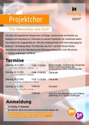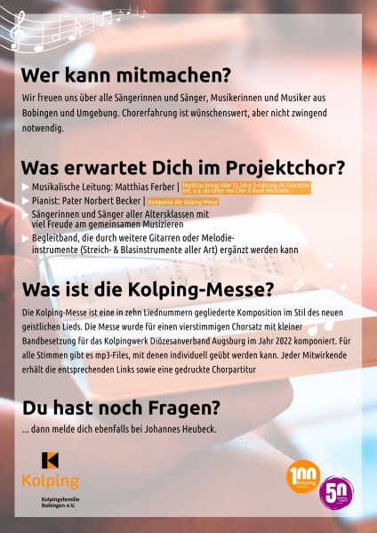 Die Kolpingsfamilie Bobingen lädt alle begeisterten Sängerinnen und Sänger, Musikerinnen und Musiker aus Bobingen und Umgebung zur Teilnahme an einem Projektchor ein. Gemeinsam soll anlässlich des Doppeljubiläums "100 Jahre Kolpingsfamilie & 50 Jahre Kolpingjugend Bobingen" die Kolpingmesse "für Menschen wie dich" von Pater Norbert Becker einstudiert und in der Abendmesse zum Kolpinggedenktag am 13. Dezember 2025 in der Pfarrkirche St. Felizitas in Bobingen gesungen werden.