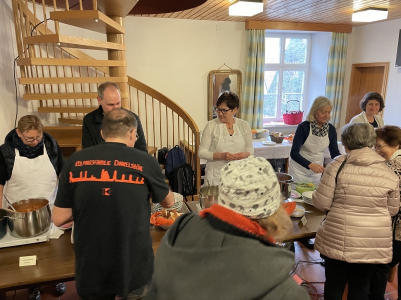 Am Misereor-Sonntag wurde nach dem von der Kolpingjugend und dem Kolping-Chor gestalteten Gottesdienst zur traditionellen Fastensuppe ins Pfarrzentrum St. Georg eingeladen. Die Gäste hatten die Wahl aus einem reichhaltigen Angebot mit insgesamt 17 verschiedenen Suppen, gekocht und gespendet hauptsächlich von Mitgliedern des Verbands. Die Veranstalter*innen freuten sich über einen gut gefüllten Pfarrsaal und die Brotspende einer örtlichen Bäckerei. Der Erlös kommt dem Dinkelsbühler Verein "Dumelang" zugute, der über Spenden, Mitgliedsbeiträge und Patenschaften das Straßenkinderprojekt "Pelo ya Jesu ya Jewa" in Bloemfontein/Südafrika von Pfarrer Alois Ganserer unterstützt. Auch die örtliche Ukraine-Hilfe darf sich freuen, denn ihr kommt der Erlös aus dem Verkauf traditioneller Palmbuschen zugute, die dieses Jahr mit Friedenstauben geschmückt waren.