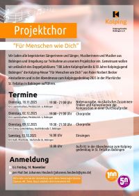 Die Kolpingsfamilie Bobingen lädt alle begeisterten Sängerinnen und Sänger, Musikerinnen und Musiker aus Bobingen und Umgebung zur Teilnahme an einem Projektchor ein. Gemeinsam soll anlässlich des Doppeljubiläums "100 Jahre Kolpingsfamilie & 50 Jahre Kolpingjugend