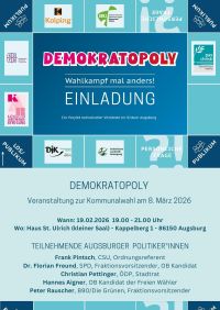 Dazu laden die Vertretungen katholischer Verbände in Augsburg ein. Die Stadt Augsburg sucht bei der Kommunalwahl eine Oberbürgermeisterin oder einen Oberbürgermeister. In lockerer Atmosphäre können die Wählenden die Kandidierenden für den Rathaussessel kennenlernen. Am Donnerstag, 19. Februar 2026, 19.00 Uhr sind alle Interessierten ins Haus Sankt Ulrich (Kappelberg 1, Augsburg) eingeladen, folgende Personen zu erleben: mehr